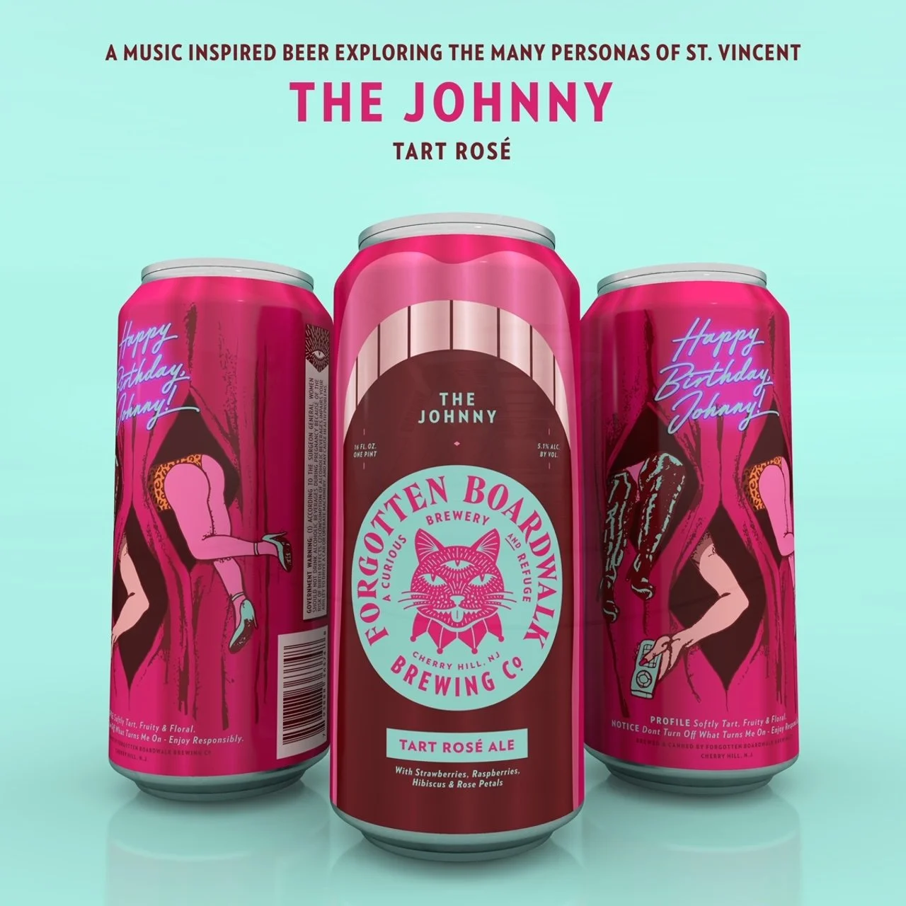 “In 2023, I wanted to re-invent The Johnny much like St. Vincent re-invents her characters on each album. I took inspiration from her album, Masseduction, and re-imagined the sad song ‘Happy Birthday Johnny’ as a sexy birthday present instead - with a certain guitar vixen popping out of the design akin to popping out of a birthday cake. This delicious beer is a Tart Rose Ale brewed with hibiscus, rose petals, strawberries and raspberries."